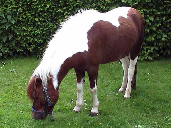 Das ist Calimera, eine 118cm grosse Ponystute. Mit ihrem gescheckten Fell fällt sie besonders auf.
